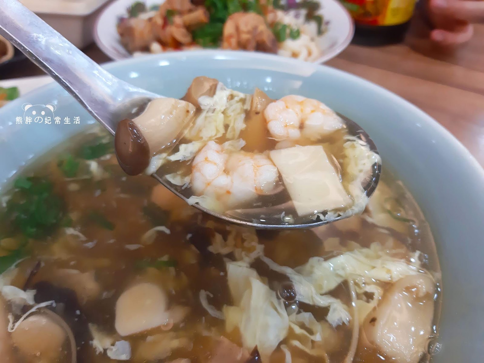 有蝦仁、蛤蠣、木耳、杏鮑菇、蛋花、蔥花等等